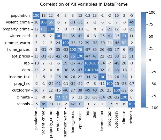 - Population isn't that highly correlated with anything: A reliable geographic stereotype is that of big cities having the highest levels of crime, as well as being significantly more expensive than smaller towns. However, there is no correlation in either direction greater than 20% between pouplation and any other factor.